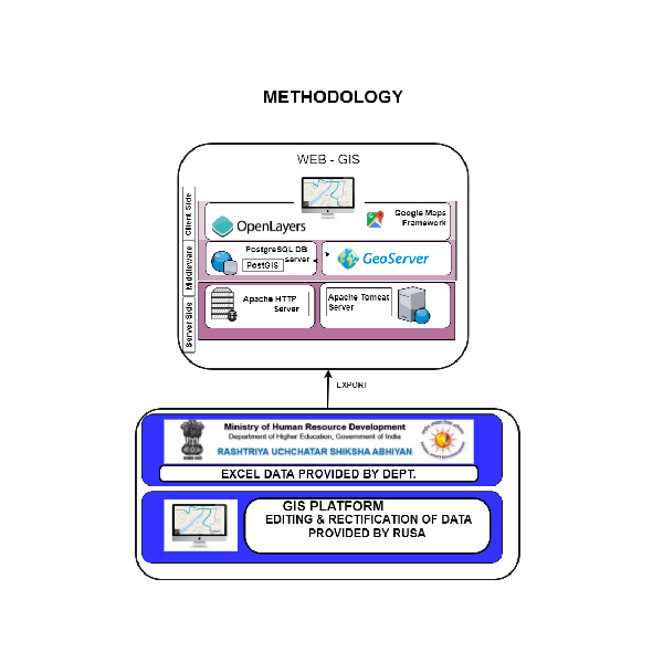 The key objectives of RUSA were to improve access, equity and quality in higher education through planned development of higher education at the state level. Objectives include creating new academic institutions, expanding and upgrading the existing ones, developing institutions that are self-reliant in terms of quality education, professionally managed, and characterized by greater inclination towards research and provide students with education that is relevant to them as well the nation as a whole. The digital mapping of educational institutions along with the ward/village boundary, road access and major settlement provides the ground reality in terms of spatial and social coverage of institutes with respect to population density