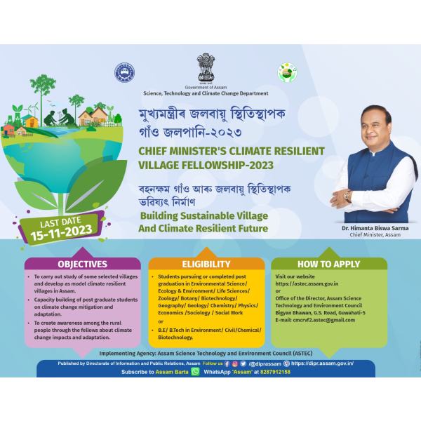 The Chief Minister's Climate Resilient Village Fellowship Programme, launched in 2022 by Science Technology and Climate Change Department, Government of Assam, is a significant initiative being implemented by the Assam Science Technology and Environment Council. Its primary goal is to enhance climate resilience and sustainable development in rural communities of Assam. Emphasizing the importance of innovation, technology adoption in a phased manner and strong leadership, the Honorable Chief Minister of Assam aims to address climate change in line with Sustainable Development Goal 13 (SDG-13). The Programme targets the participation of 100 post-graduate science students and engineering graduates, who will study climate change impacts and potential solutions in 100 villages in phased manner. The selected fellows will receive one time fellowship of Rs. 20,000, along with training, resources, support, and guidance from scientific institutions to implement innovative climate change solutions in their respective villages.